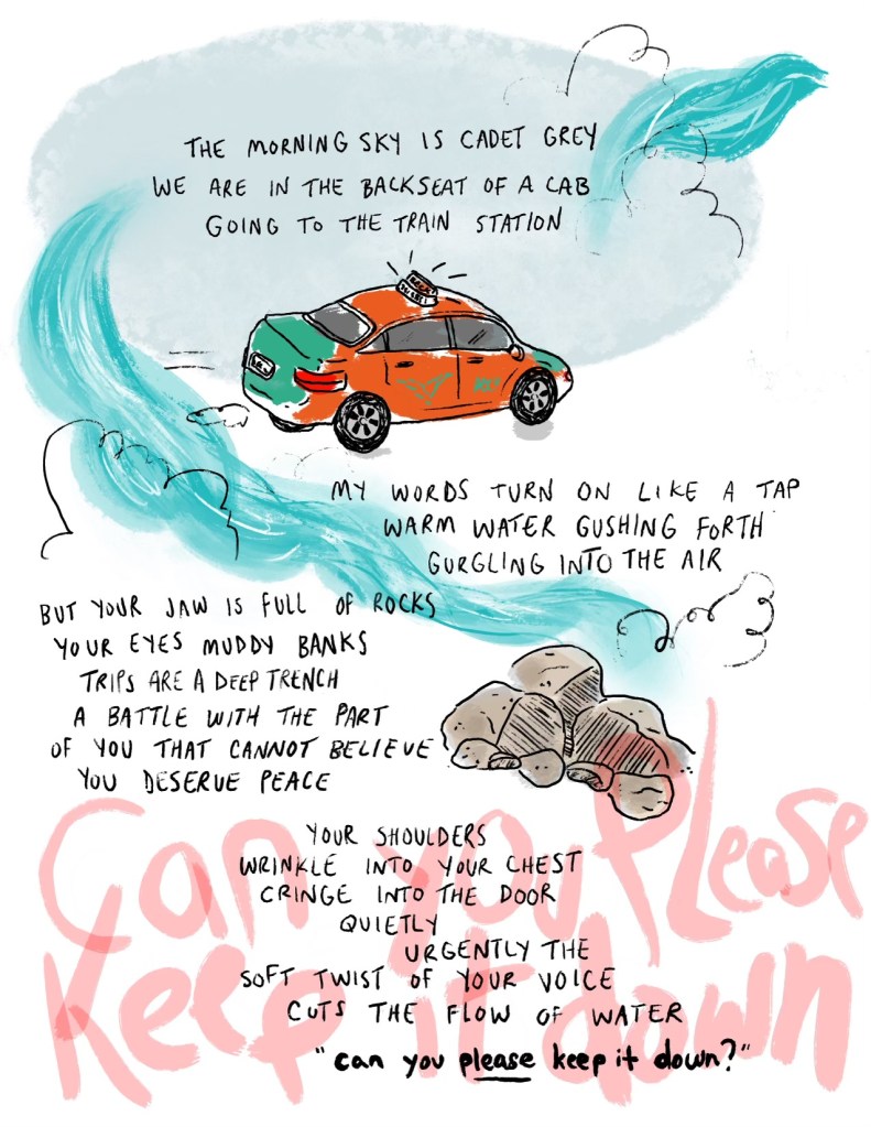 His eyes closed against the pressure of the sun, Derrick watches small vitreous fibers float through the hot pink sea inside his head. He has chosen the spot on the beach that’s as far away from people as possible. He opens his eyes and looks down at his legs, tinged a sickly yellow from the SPF 100 he’s just slathered on. He sits under an umbrella, arms crossed over his favorite Warhammer t-shirt. The old towel he’d taken from his parents’ linen closet has a large faded Tigger on it, the image punctured by white and orange pilling. Gently placing his hand on Tigger’s muted face, he begins to mumble under his breath in a monotone refrain: